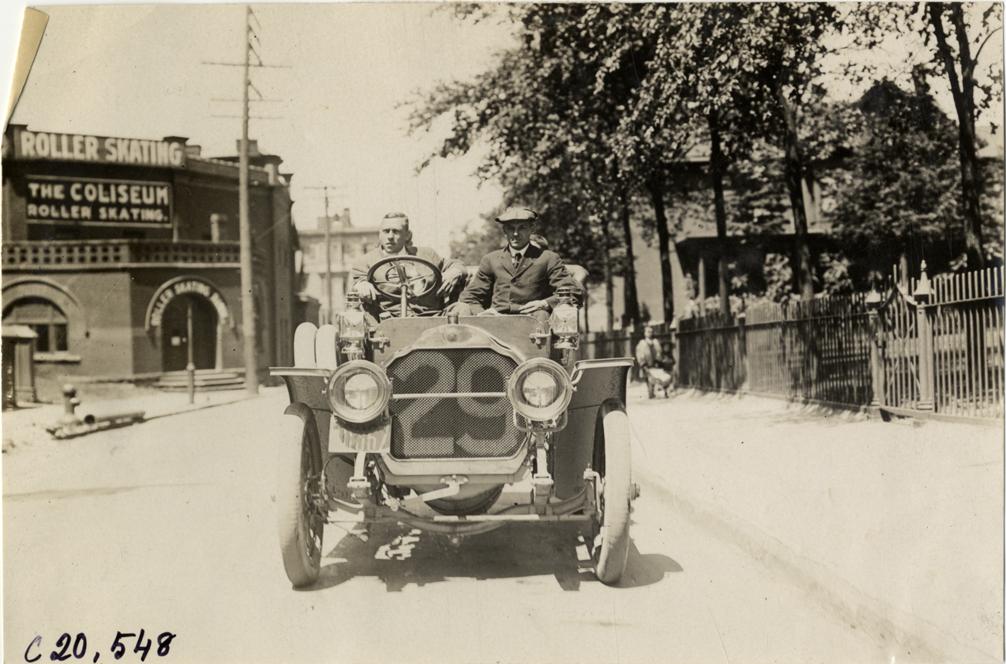 Front view of motorists posing in Garford car no. 29 at Buffalo, New York during the 1908 Glidden Tour. Coliseum roller skating rink in background. Handwritten on back: "Tours--Glidden Tour, 1908."