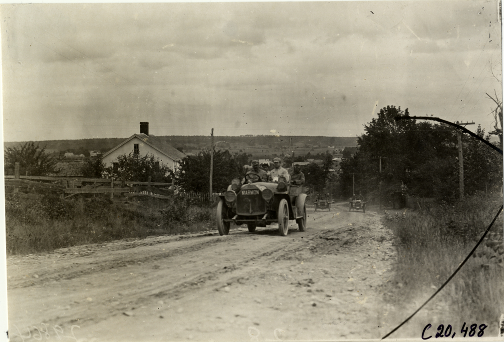 Motorists in Marmon automobile traveling on rural road, 1908 Glidden Tour