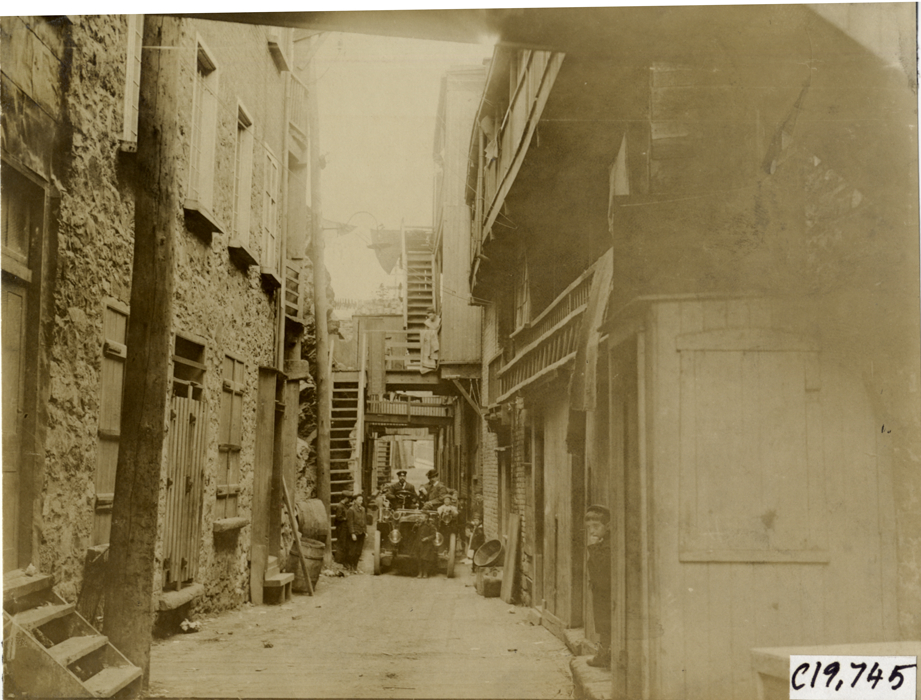 Motorists and children with automobile on narrow street, 1906 Glidden pathfinding expedition