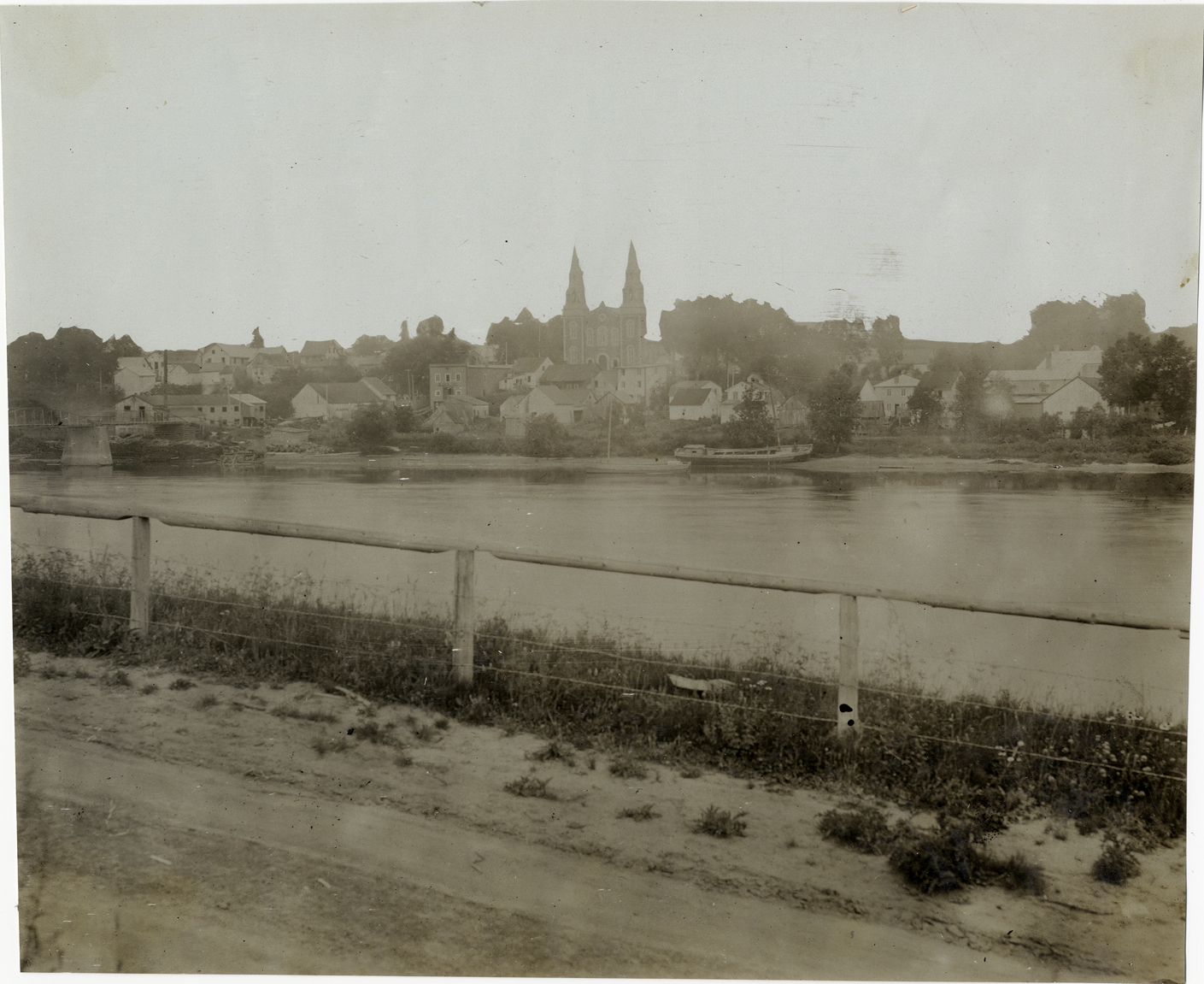 View of river during the 1906 Glidden Tour. Fence in foreground; buildings on opposite bank of river. Handwritten on back: "Tours--Glidden Tour, 1906."