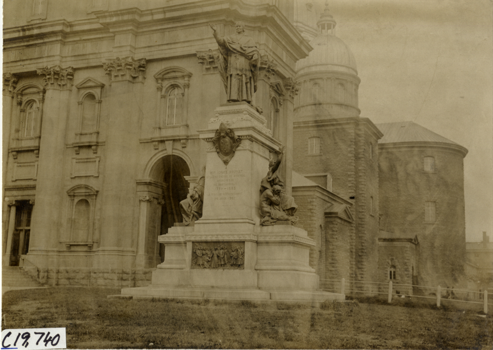 View of Ignace Bourget monument in front of the Cathedrale Marie-Reine-du-Monde at Montreal, Quebec during the pathfinding expedition for the 1906 Glidden Tour. Handwritten on back: "Tours--Glidden Tour Pathfinder, 1906."