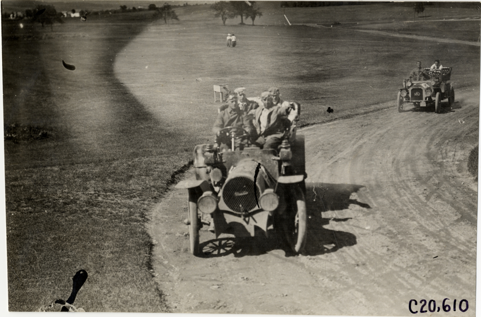 View of motorists in Franklin and Reo cars during the 1908 Glidden Tour. Handwritten on back: "Tours--Glidden Tour, 1908."
