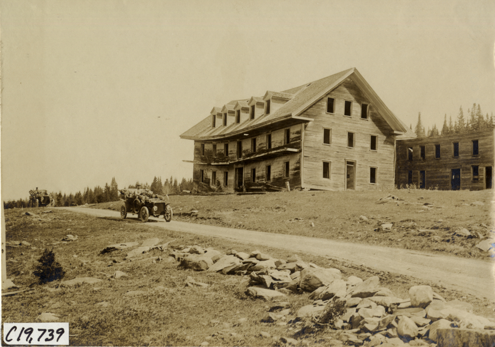 Automobile parked in front of abandoned house, 1906 Glidden pathfinding expedition