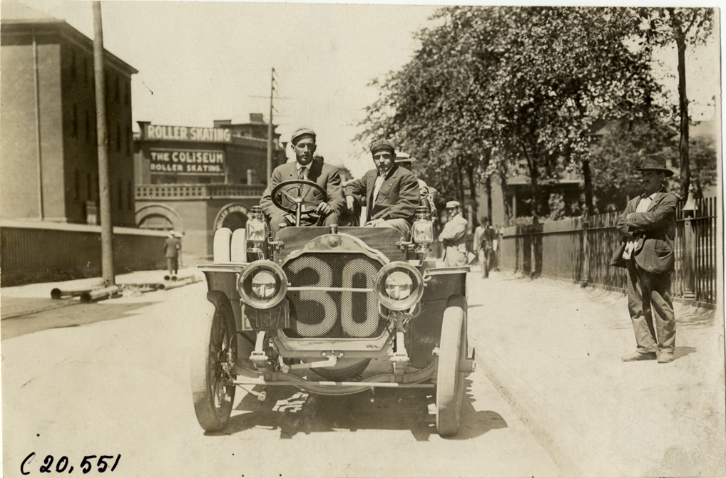 Front view of motorists posing in Garford car no. 30 at Buffalo, New York during the 1908 Glidden Tour. Coliseum roller skating rink in background. Handwritten on back: "Tours--Glidden Tour, 1908."