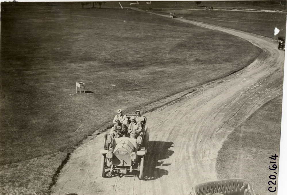 Bird's-eye view of motorists in Marmon car no. 23 during the 1908 Glidden Tour. Handwritten on back: "Tours--Glidden Tour, 1908."