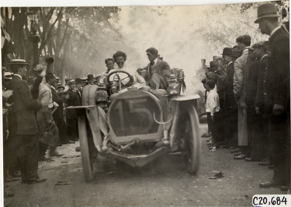 Joan Cuneo and passengers in Rainier automobile at Saratoga Springs, New York, 1908 Glidden Tour