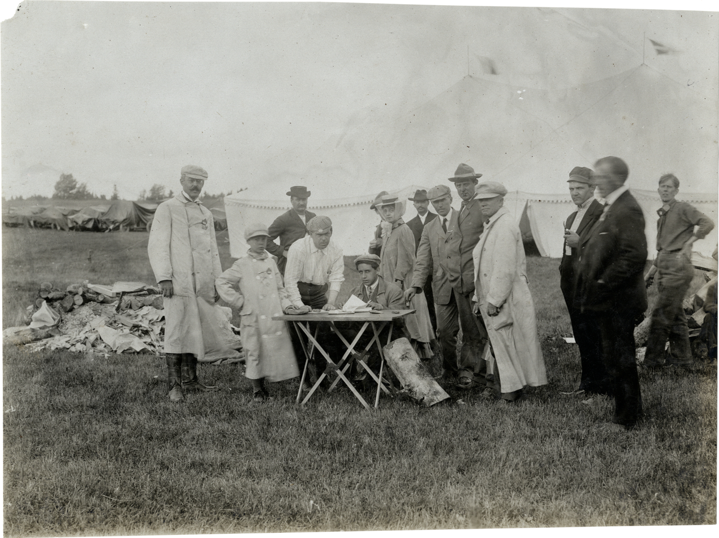 View of motorists gathered around a small folding table at Jackman, Maine during the 1906 Glidden Tour. Tent in background. Handwritten on back: "Tours--Glidden Tour, 1906."
