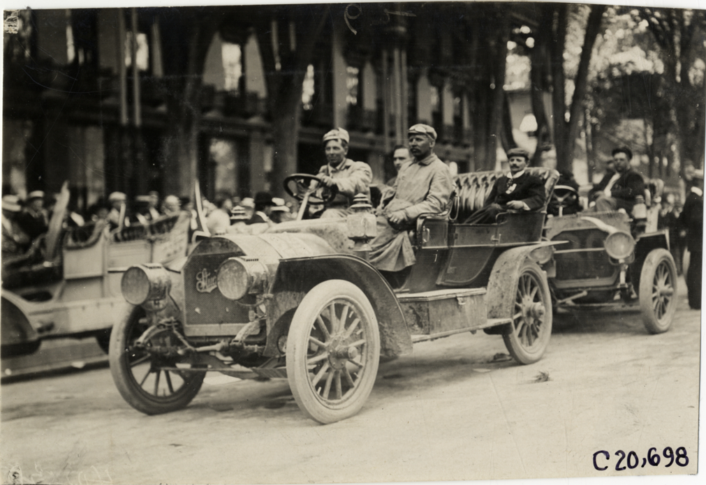 View of motorists in Studebaker car at Saratoga Springs, New York during the 1908 Glidden Tour. Handwritten on back: "Tours--Glidden Tour, 1908."