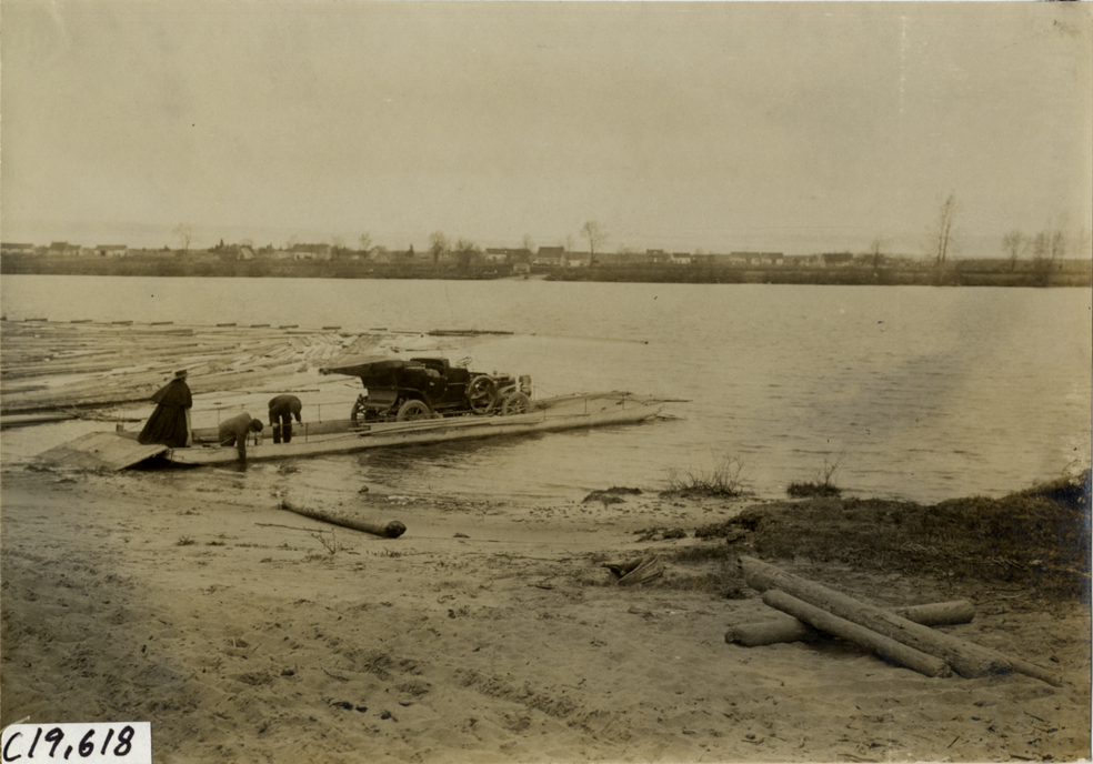 Automobile on flatboat, 1906 Glidden pathfinding expedition