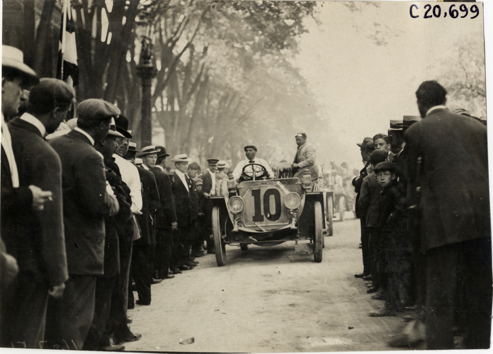 View of motorists in Gaeth car no. 10 at Saratoga Springs, New York, surrounded by spectators, during the 1908 Glidden Tour. Handwritten on back: "Tours--Glidden Tour, 1908."