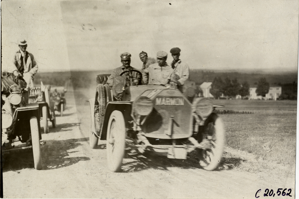 View of motorists posing in Marmon car no. 21 during the 1908 Glidden Tour. Handwritten on back: "Tours--Glidden Tour, 1908."