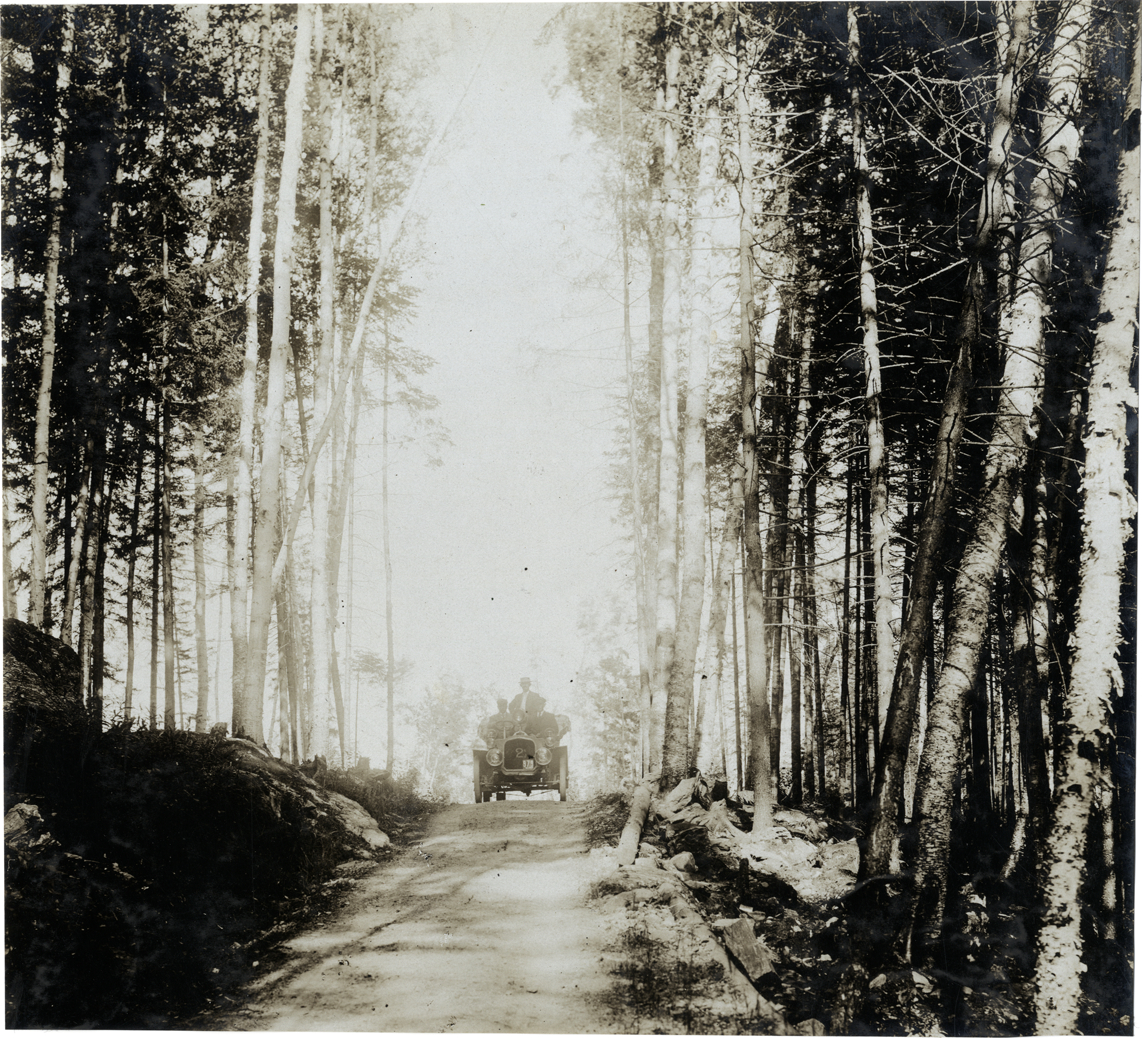View of motorists in car traveling on dirt road through woods during the 1906 Glidden Tour. Handwritten on back: "Tours--Glidden Tour, 1906."