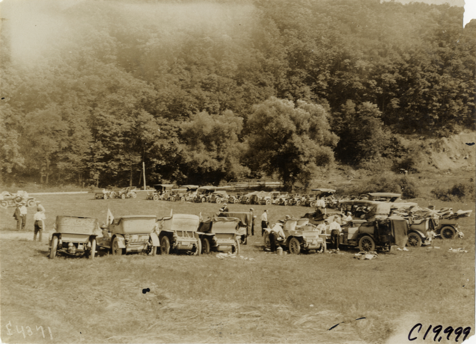 Distant view of motorists with cars on the grounds of the Bedford Springs resort at Bedford, Pennsylvania during the 1907 Glidden Tour. Stamped on back: "Photo by N. Lazarnick, 29 West 42nd Street, New York." Handwritten on back: "Resting at Bedford Springs. Tours--Glidden Tour, 1907."