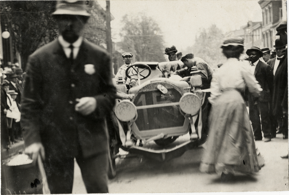 Joan Cuneo and policeman standing in front of Rainier automobile, 1908 Glidden Tour