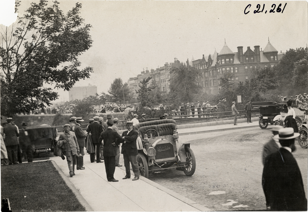 Motorists and spectators with automobiles in street, 1908 Glidden Tour