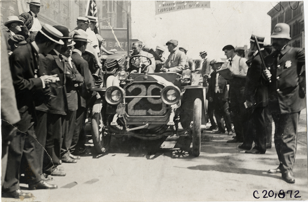 View of motorists in Garford car no. 29, surrounded by spectators, in front of the Teck Theatre at Buffalo, New York during the 1908 Glidden Tour. Handwritten on back: "Tours--Glidden Tour, 1908."