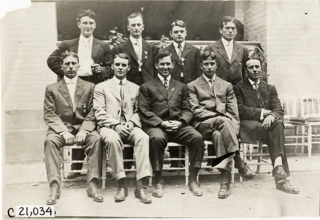 Group portrait of Peerless team during the 1908 Glidden Tour. Handwritten on back: "Tours--Glidden Tour, 1908."