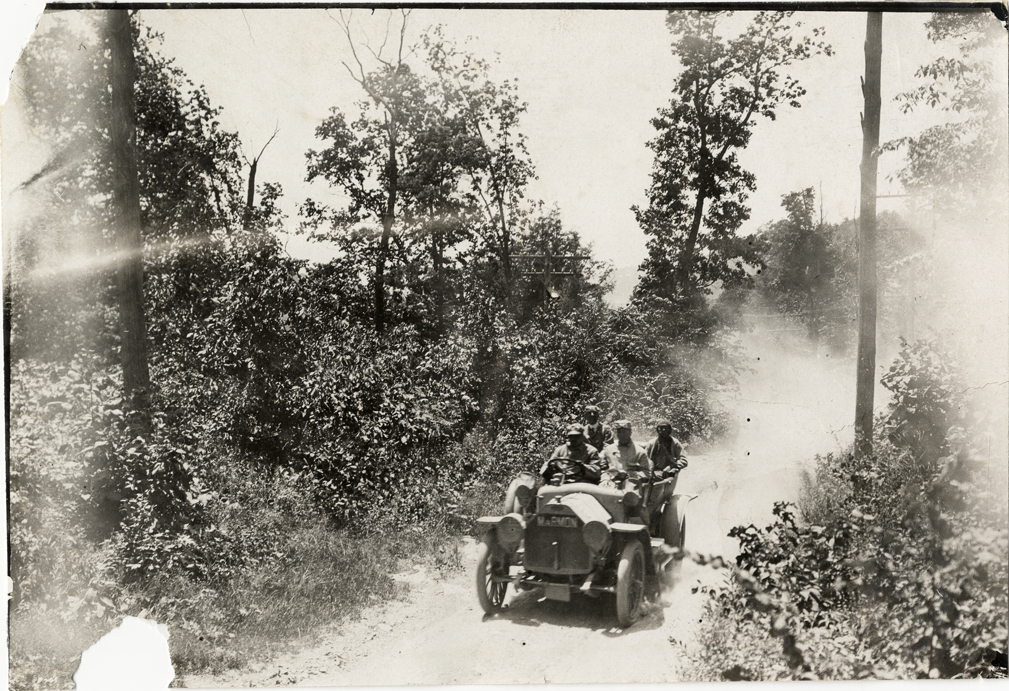View of motorists in Marmon car traveling on mountain road during the 1908 Glidden Tour. Handwritten on back: "Tours--Glidden Tour, 1908."