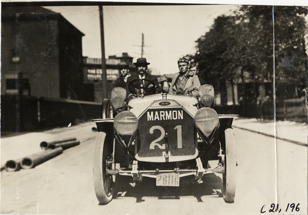 Front view of motorists posing in Marmon car no. 21 at Buffalo, New York during the 1908 Glidden Tour. Coliseum roller skating rink in background. Handwritten on back: "Tours--Glidden Tour, 1908."