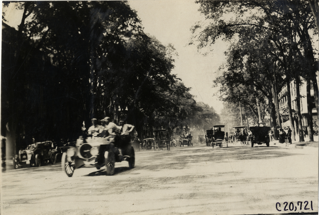 Motorists in Franklin automobile traveling on tree-lined street, 1908 Glidden Tour