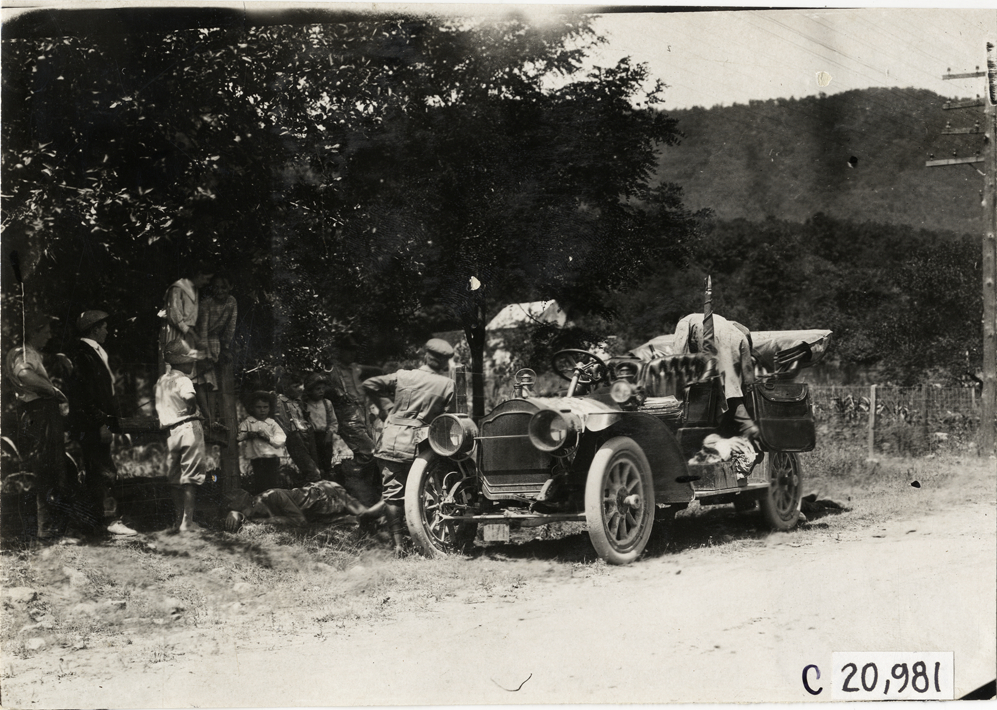 View of motorists with car on side of rural dirt road during the 1908 Glidden Tour. Group of boys stands on roadside. Handwritten on back: "Tours--Glidden Tour, 1908."