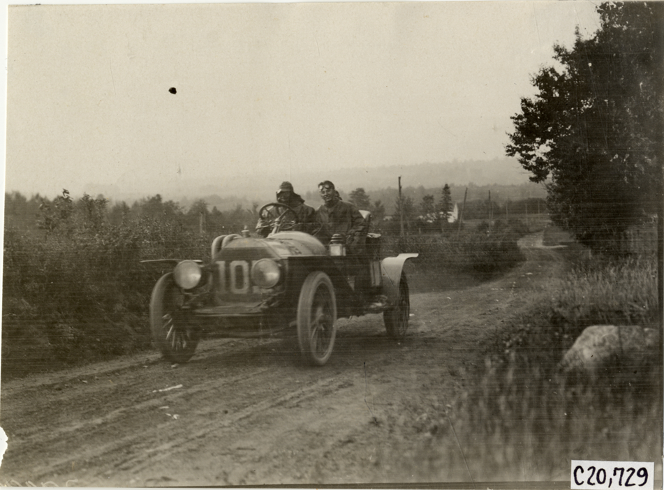 Motorists in Pierce Great Arrow automobile traveling on rural road, 1908 Glidden Tour