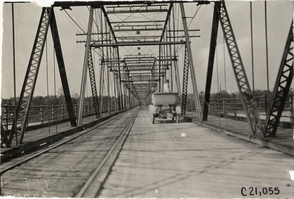 Rear view of car crossing bridge during the 1908 Glidden Tour. Handwritten on back: "Tours--Glidden Tour, 1908."