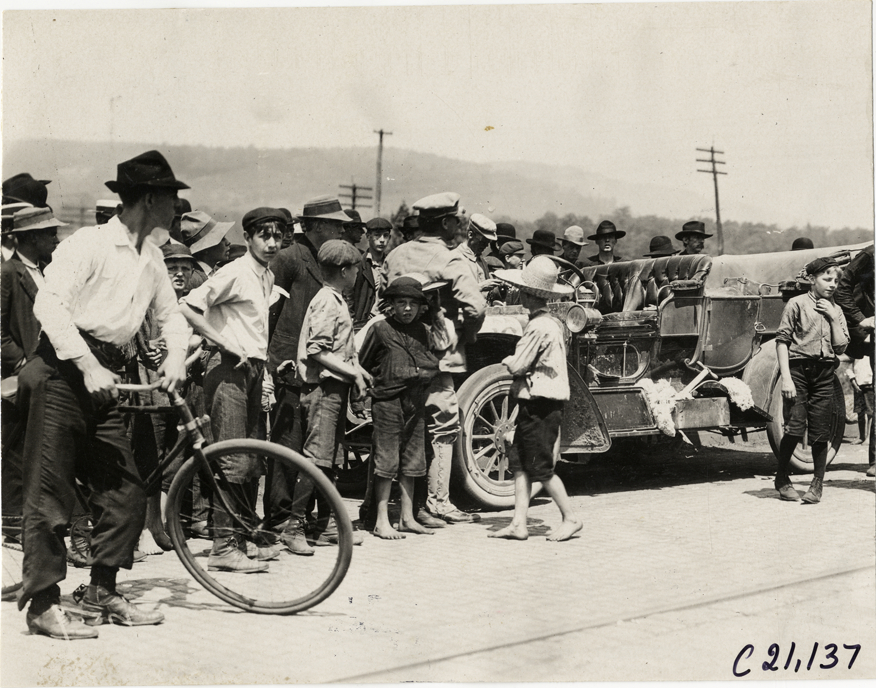 View of spectators, including a group of boys, during the 1908 Glidden Tour. Man with bicycle in foreground; car in background. Handwritten on back: "Tours--Glidden Tour, 1908."