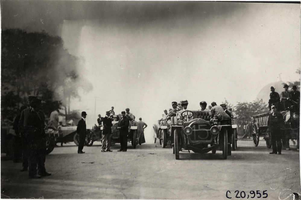 Distant view of Joan Cuneo and passengers in Rainier car no. 15 during the 1908 Glidden Tour. Motorists with cars in background; horse-drawn wagon on right. Handwritten on back: "Tours--Glidden Tour, 1908."