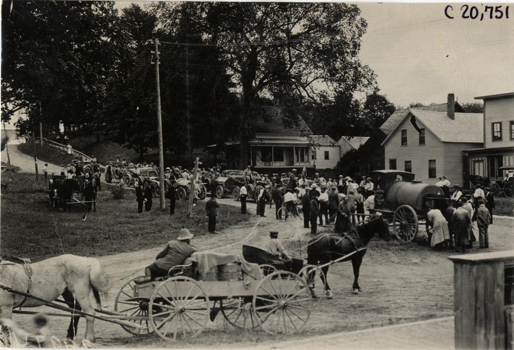 View of spectators surrounding cars lined up in road during the 1908 Glidden Tour. Horse-drawn wagons in foreground; wagon carrying cylindrical water tank in background. Handwritten on back: "Tours--Glidden Tour, 1908."