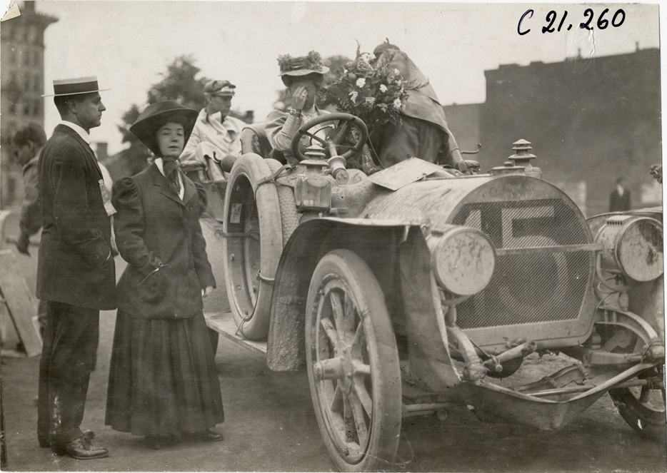 Joan Cuneo in Rainier automobile, 1908 Glidden Tour