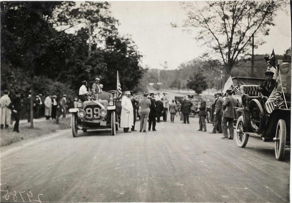 View of motorists and spectators with cars in road during the 1908 Glidden Tour. Pierce Great Arrow car no. 99 in foreground. Handwritten on back: "Tours--Glidden Tour, 1908."