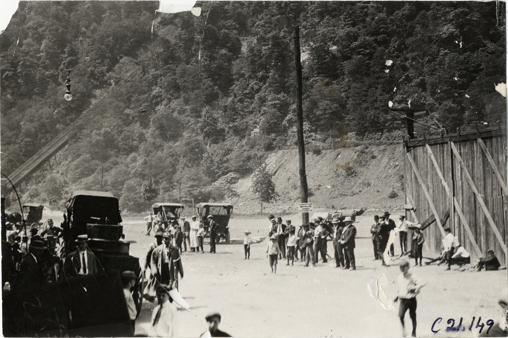 View of spectators and cars on road at base of mountain during the 1908 Glidden Tour. Handwritten on back: "Tours--Glidden Tour, 1908."