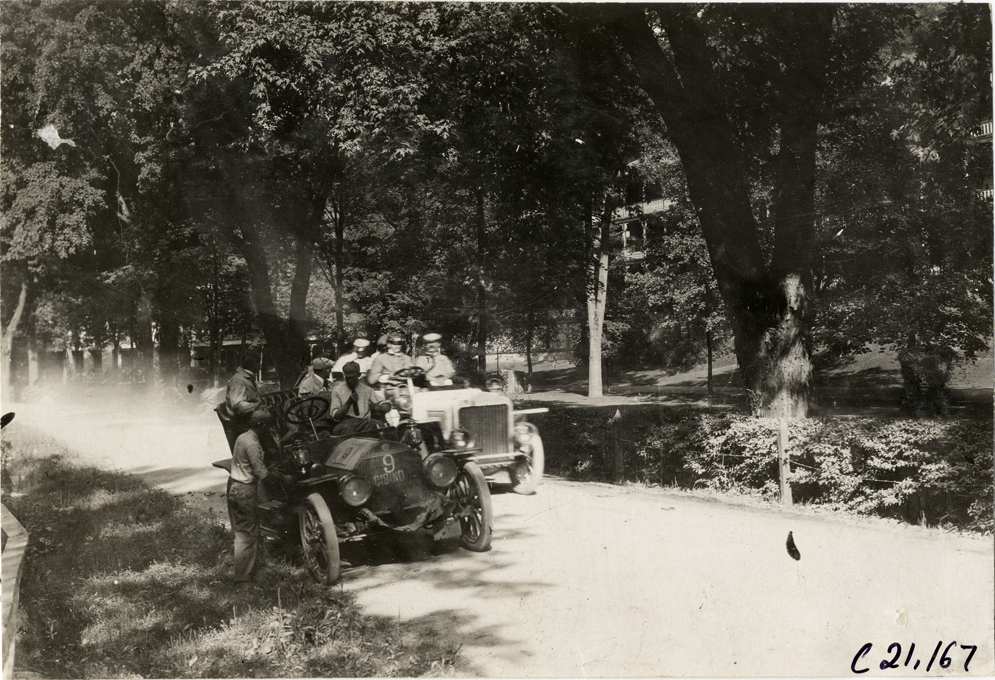 View of motorists in Premier car no. 9, followed closely by another car, in front of the Bedford Springs Hotel at Bedford, Pennsylvania during the 1908 Glidden Tour. Handwritten on back: "Tours--Glidden Tour, 1908."