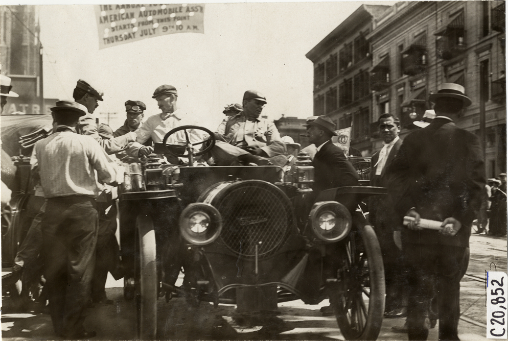 Motorists in Franklin automobile in front of Teck Theatre at Buffalo, New York, 1908 Glidden Tour