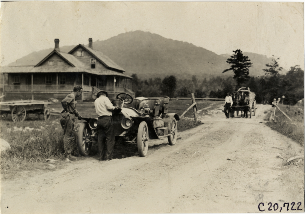 View of two men filling radiator of car on roadside during the 1908 Glidden Tour. Wooden-frame house and horse-drawn wagon in background. Handwritten on back: "Tours--Glidden Tour, 1908."
