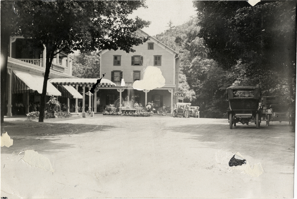 View of the Kittatinny House at Delaware Water Gap, Pennsylvania during the 1908 Glidden Tour. Fountain and "Cafe" sign in background. Handwritten on back: "Tours--Glidden Tour, 1908."