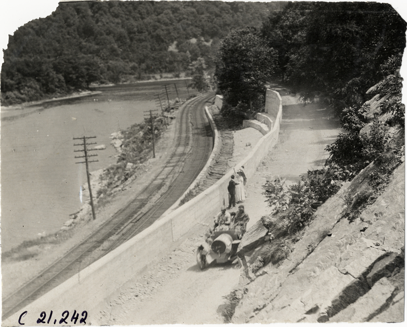 Bird's-eye view of motorists in Franklin car traveling on mountain road at Delaware Water Gap during the 1908 Glidden Tour. Wall separates road from railroad tracks. Handwritten on back: "Tours--Glidden Tour, 1908."