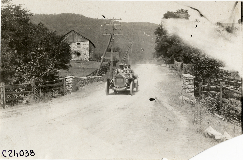 Motorists in Overland automobile traveling on rural road, 1908 Glidden Tour