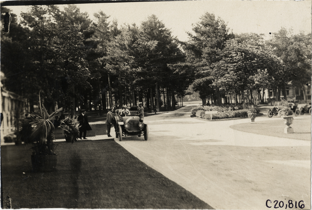 View of motorists in Pierce Great Arrow car no. 1 parked on driveway during the 1908 Glidden Tour. Palms in urns decorate the grounds. Stamped on back: "Spooner & Wells, Inc., photographers, telephones 3472-3473 Columbus, 1931 Broadway, New York." Handwritten on back: "Tours--Glidden Tour, 1908."