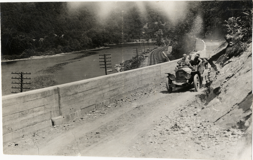 View of motorists in Peerless car no. 5 traveling on mountain road at Delaware Water Gap during the 1908 Glidden Tour. Wall separates road from railroad tracks. Handwritten on back: "Tours--Glidden Tour, 1908."