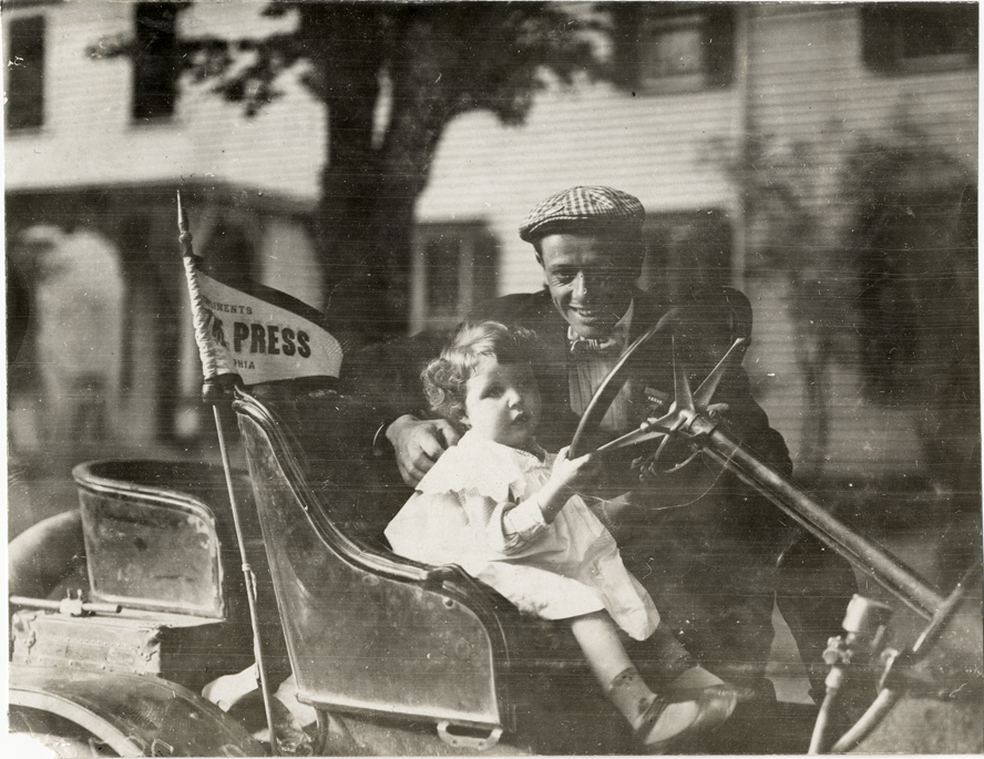 Girl posing behind wheel of press automobile, 1908 Glidden Tour