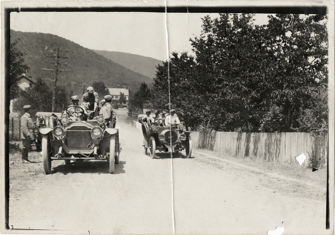 View of motorists in Franklin car passing car on roadside during the 1908 Glidden Tour. Mountains in background. Handwritten on back: "Tours--Glidden Tour, 1908."
