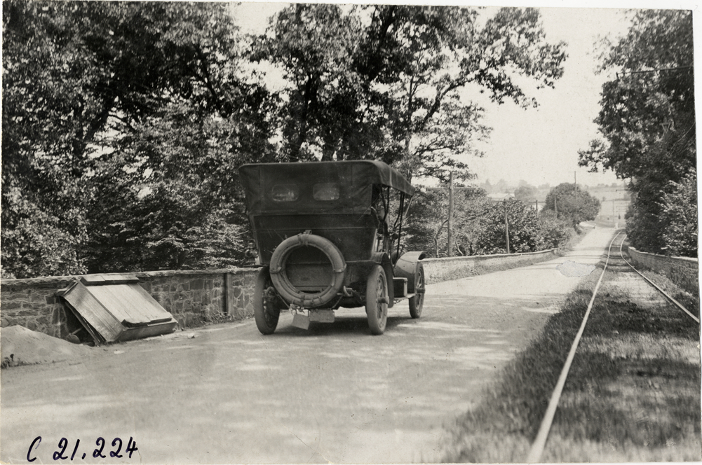 Rear view of car traveling on road during the 1908 Glidden Tour. Road is bordered by stone walls. Handwritten on back: "Tours--Glidden Tour, 1908."