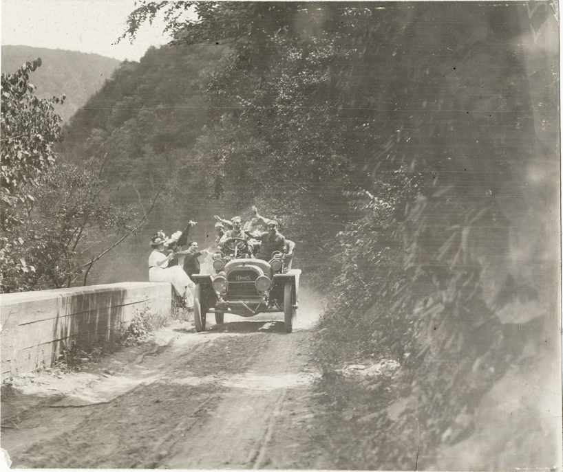 Motorists in Haynes automobile traveling on mountain road at Delaware Water Gap, 1908 Glidden Tour