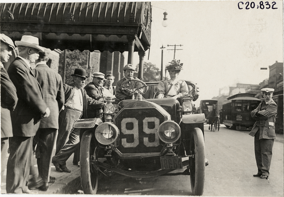 Close-up view of couple in Pierce Great Arrow car no. 99 in front of the Teck Theatre at Buffalo, New York during the 1908 Glidden Tour. Handwritten on back: "Tours--Glidden Tour, 1908."