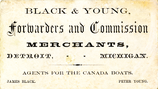 View of a business card for Black & Young. Printed on front: "Black & Young, forwarders and commission merchants, Detroit, Michigan. Agents for the Canada boats. James Black, Peter Young."