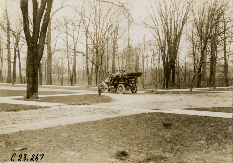View of motorists in E-M-F car on street lined with bare trees during the pathfinding expedition for the 1909 Glidden Tour. Handwritten on back: "Tours--Glidden Tour Pathfinder, 1909."