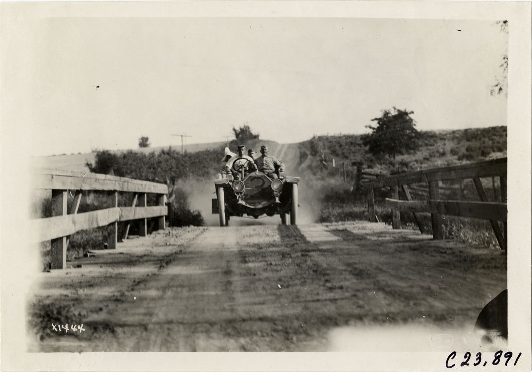 Motorists in Chalmers automobile crossing bridge, 1910 Glidden Tour