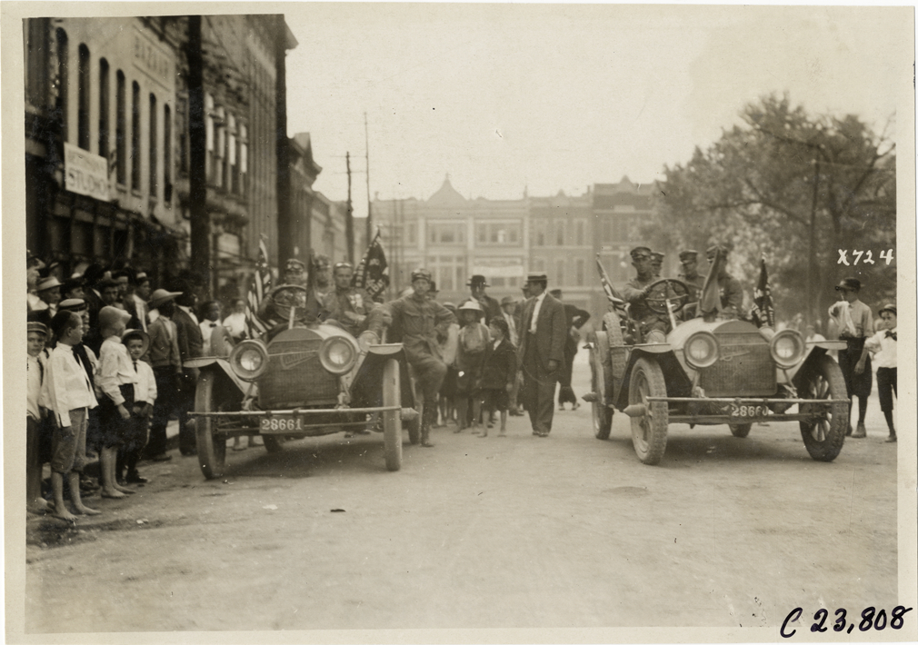 View of motorists posing with two Cadillac cars, surrounded by spectators, during the 1910 Glidden Tour. Commercial buildings in background. Stamped on back: "Spooner & Wells, Inc., photographers, telephone North 1745. 1231 Woodward Ave., Detroit, Mich. Detroit, 1231 Woodward, New York, 1931 Broadway." Handwritten on back: "Tours--Glidden Tour, 1910."